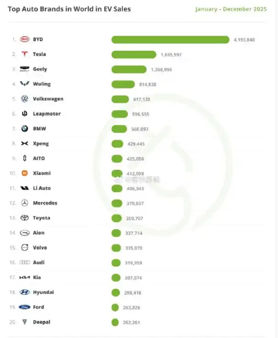 2月25日音讯,Clean Technica公布了2025年各人新动力汽车销量TOP20榜单。比亚迪以419.38万辆的销量稳居榜首,特斯拉以163.6万辆位居第二,时时彩小米以41.2万辆初次进入各人前十。