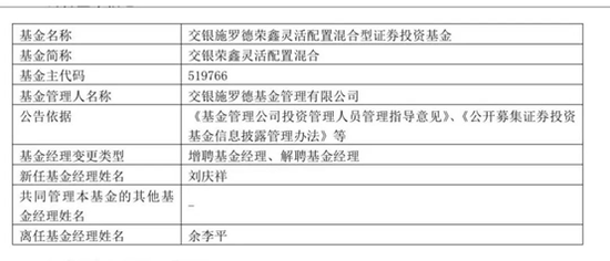有点短暂,节前终末一个往还日,交银荣鑫发了基金司理变更公告,基金司原理余李平变更为刘庆祥。